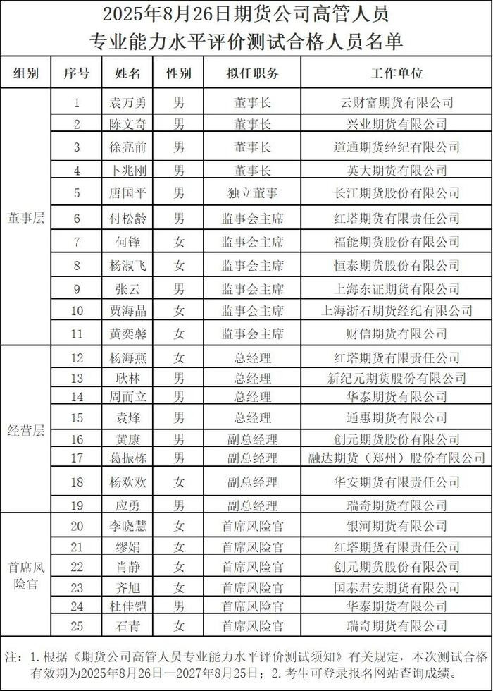 8月26日,中国期货业协会发布新一期期货公司高管人员专业能力水平评价测试合格人员名单。